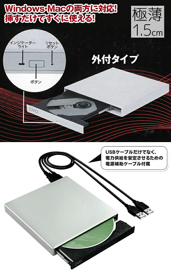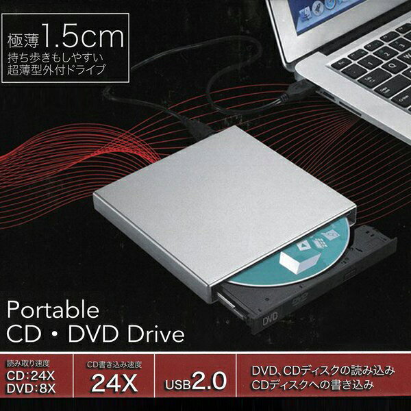 超薄型1.5cm 外付け ポータブルCD・DVDドライブ 持ち歩きもラクラク! 極薄型1.5cmの外付ドライブ! 収納場所に困らない極薄1.5cmのDVDドライブ登場。
